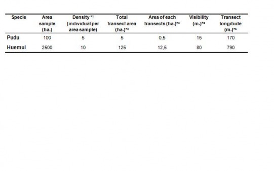 *1: Density represent the number of individual per sample area expect to find considering a average home range of 250 ha. for Huemul and 20 ha. for Pudu. *2: Total transect designed for asses the 5% of sample area. *3: Transect area were estimated considering a 10 transect for sample; Transect area = [Total transect area / 10], *4: Visibility Is the maximum distance of animal observation from transects. *5: Transect longitude: Transect longitude = Transect area / (visibility*2).