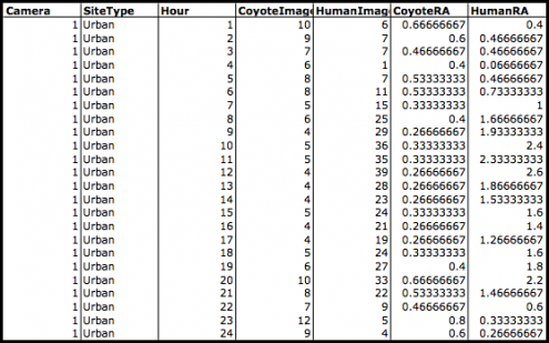 Table 2. Data set of mean relative activity levels for coyotes and humans in each site.
