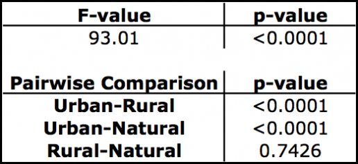 the urban sites). The natural sites have a high p-value (0.1359) and a