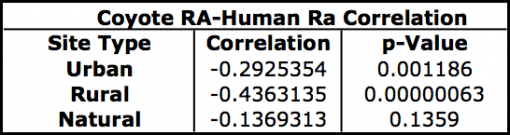 Table 3. Overall correlation between human relative activity and coyote relative activity across all site types.