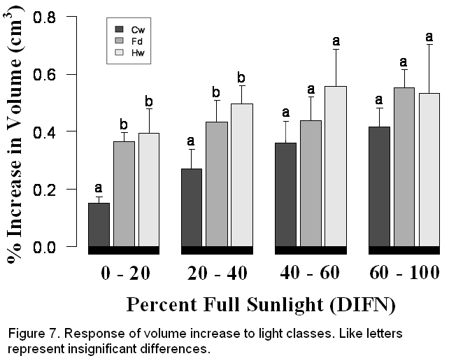 species volume increments are compared on a percent of full sunlight