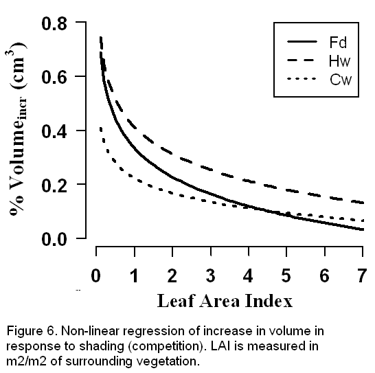 volume increase is proportional to the log increase in LAI. All species
