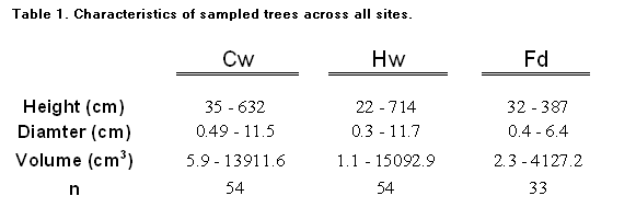 (contiunous variable), taken at each sample tree. Three logorithmic