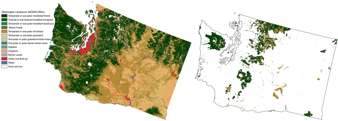 The first step in this analysis is to extract the land cover of the state (CCRS, 2010) and the land cover that is contained within the protected areas. The master tables for Protected Areas and Western North America shown on the Methods & Data page can then be read into R programming where the total square kilometers of each land cover class in the state and in protected areas can be calculated from converting the number of 250m pixels to number of square kilometers. This allows us to see exactly how much of each land cover class exists in Washington, how much land is being protected and what exactly is being protected. For the purposes of this study we want to know how much forest exists in the state and how much of the forested land is currently being protected. The output tables from this can be seen below (Table 1 and Table 2). We can sum Table 1 and Table 2 to determine how much land is being protected in Washington compared to their landbase. We can use Table 2 to determine how much of Washington's forested land is being protected compared to how much forest the state contains. Washington is protecting approximately 12% of their landbase and protecting approximately 19% of their forests. These results can be seen in Figure 1a and 1b on the Results page, this has been done for every jurisdiction in the study area.