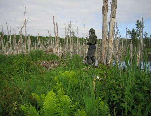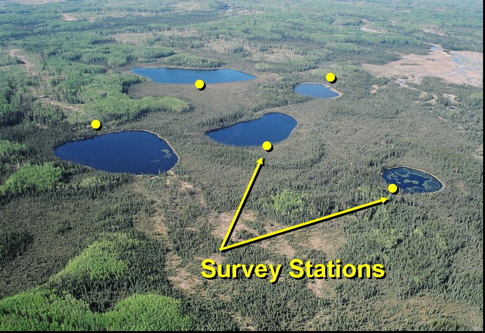 Surveys took place from June 1stst to July 4thof 2003 and 2004 beginning at sunrise and ending no later than 5 hours past sunrise.. To reduce inter-observer variability all observers underwent a period of training in identification of boreal birds by sight and sound, distance training and data recording protocols. At each wetland, a 20 minute waterfowl survey, a playback protocol, and a 10 minute point count, were conducted. This combined methodology was developed specifically to accurately assess as much of the riparian- and wetland-associated bird community as possible. Each station was strategically located to maximize visibility and sound detection for as much of the wetland as possible (Fig. 1) At wetlands up to 16 ha, in size 1 point count station was established. For wetlands greater than 16 ha two stations were used.