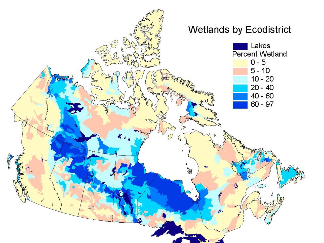 | Fig. 1. Percent cover by wetlands by ecodistrict in Canada. Note the highest densities(40-90%) occur in the boreal forest. In western Canada, cover is greatest in the boreal plain ecozone outlined in red in Fig. 2 (Source: National Wetland Dataset, Environment Canada). | ![]() |