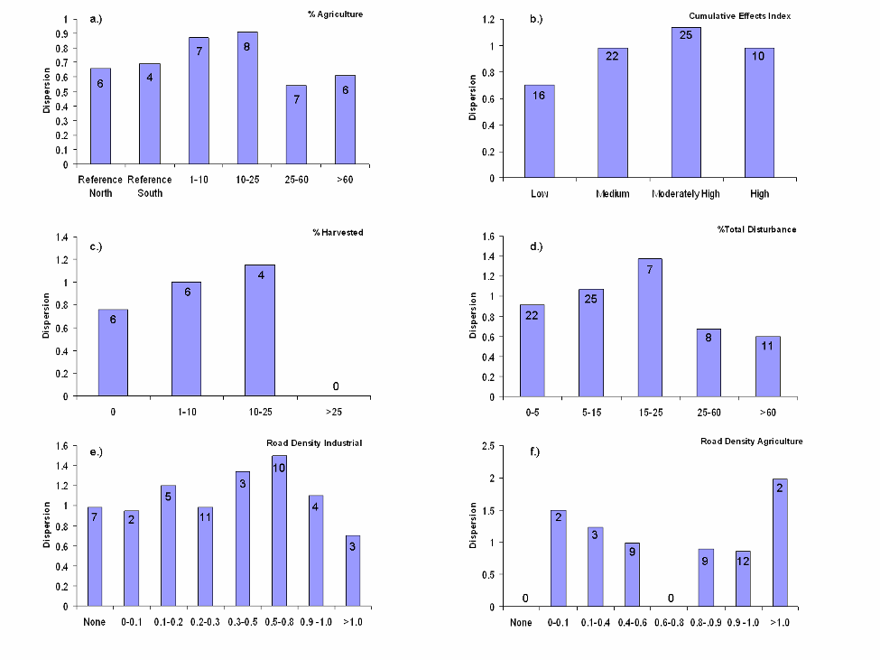 | Fig. 5. Multivariate dispersion for increasing levels of disturbance.a.) agriculture, b.) cumulative effects index c.) %harvested d.) % total disturbance e.) road density(km/km2) for industrial portion of study area and f.) road density(km/km2) for portion of study area most affected by agriculture. Dispersion was calculated among blocks of a given disturbance grouping. Patterns observed above also held when calculated among wetlands of a particular disturbance grouping, and when using raw data, presence absence data, or as pictured here, using log transformed data. |