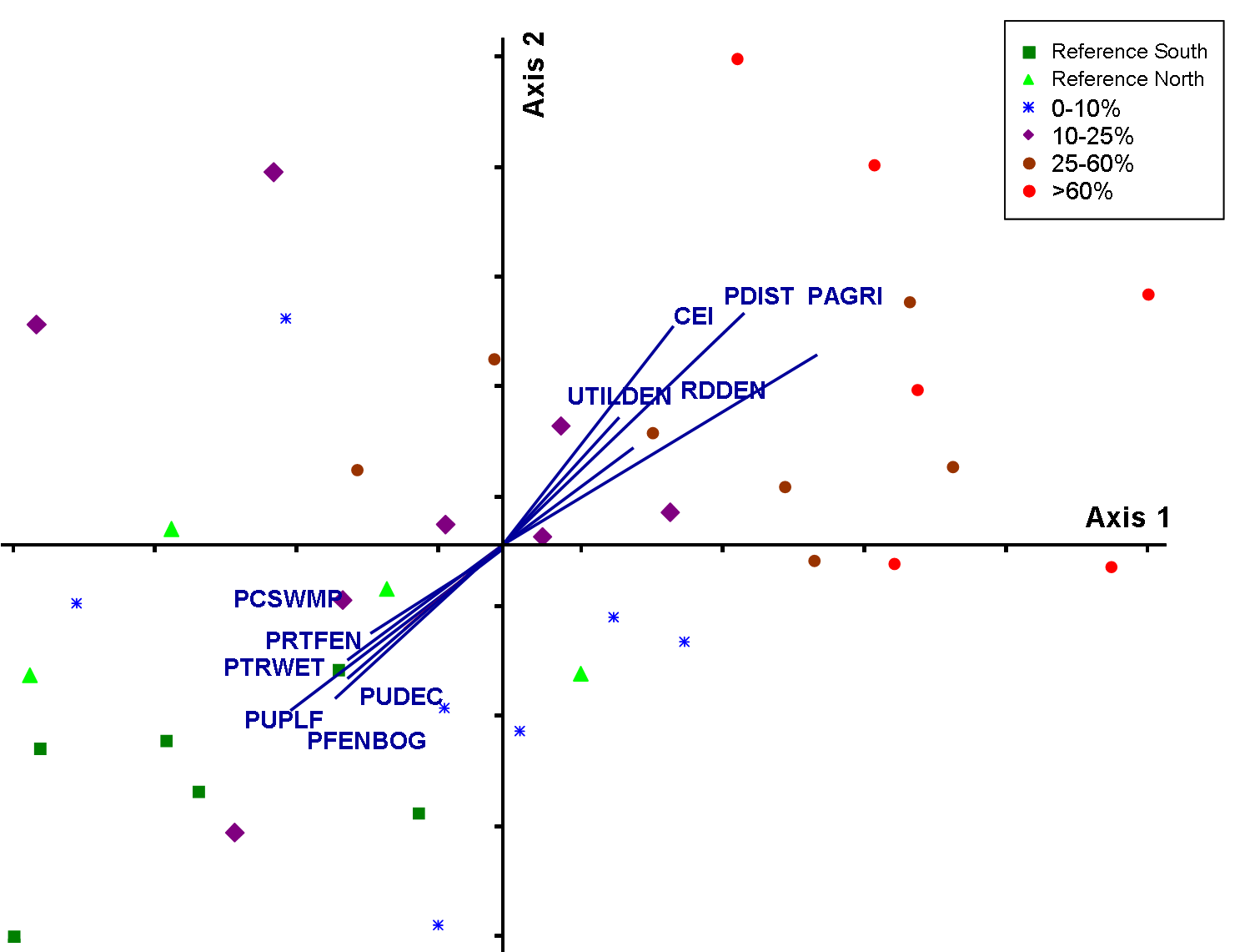 Linear disturbances such as roads, seismic lines and utilities tend to result in greater habitat fragmentation than loss, thus I expected effects on the bird community to be more subtle. The NMS analysis containing only industrial disturbance showed a strong distribution of sites that seemed related to habitat variables, notably proportion of treed wetlands and of shrub-dominated wetlands (Fig. 4). In contrast to the agricultural gradient, I found very little community response to landscape disturbance at this scale (Fig.4).