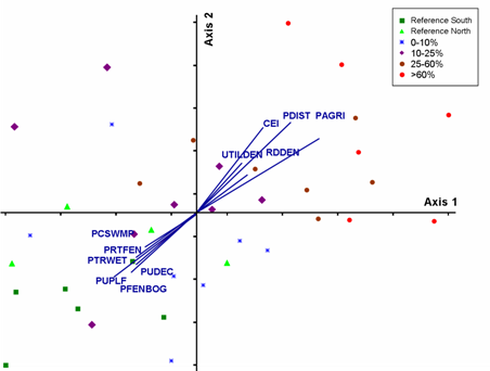 Since agricultural conversion results in the greatest habitat loss relative to other disturbances, I predicted that it would also result in the greatest change in community composition. An NMS that included all 75 blocks in one analysis supported this prediction, but was visually difficult to interpret for all disturbances combined. I therefore conducted two separate NMS analyses, one using only sites along an agricultural gradient and another for sites along an industrial gradient. A total of 85% of the variance in species composition among blocks was represented by the ordination diagram resulting from the agricultural analysis (Fig. 3). Subsequent overlays of environmental variables illustrate that birds are responding to a loss of native vegetative cover including a decrease in cover of upland forest and treed wetlands (Fig. 3a). While a description of the response of individual species to each disturbance gradient is beyond the scope of this paper, species in agriculture-dominated sites tended to be generalists and early successional species (Fig. 3b). Species dependent on tree cover (e.g., cavity nesting ducks, Winter Wren) occurred at the opposite end of the gradient.