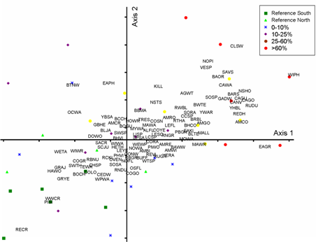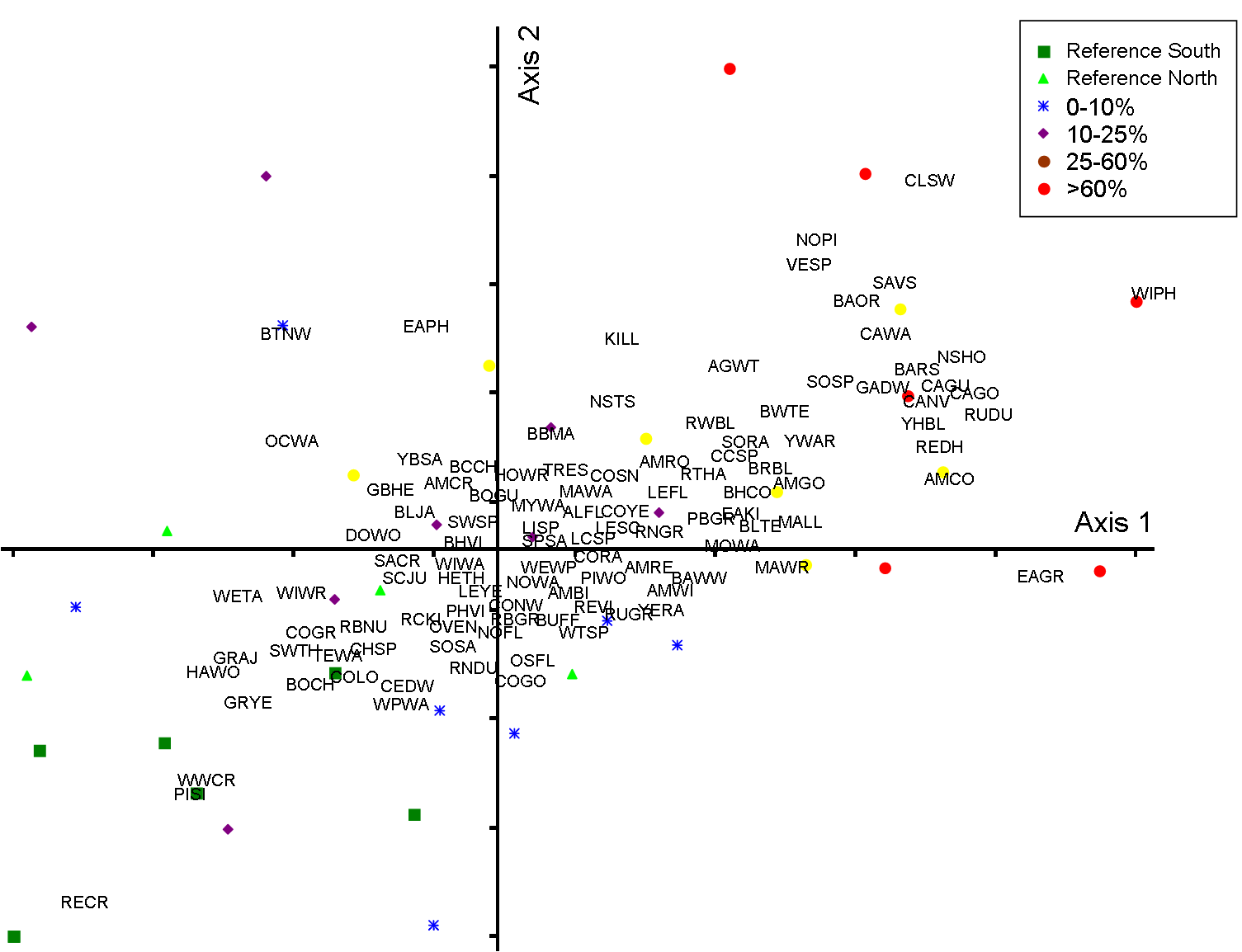 Fig. 3b.) Results of same NMS analysis as in 3a. with bird species represented by 4 letter American Ornithological Union Codes. Species codes, common names and scientific names of bird species are included in Table 1. Colors and shapes of symbols represent categories by percent of agricultural disturbance. Click graphic to see larger version. |