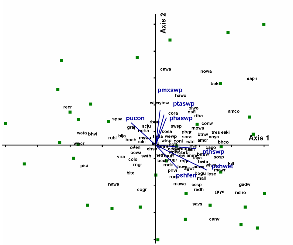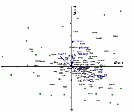 Fig.4. NMS diagram for species composition of blocks selected to represent a gradient of industrial landscape disturbance. NMS permits resizing of symbols to reflect a continuous scale of disturbance. There was no pattern for any individual disturbance, nor for all industrial disturbances combined. Bird species are identified using four letter American Ornithological Union Codes. Species codes, common names and scientific names of bird species are included in Table 1. Based on overlays of habitat variables birds appear to be responding to landscape availability of tree- and shrub-dominated wetland types.bbreviations for environmental variables are described in Table 2. Click graphic to see larger version. |