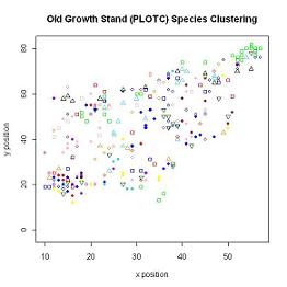 Along with the frequency, the relative location was available for each species in each plot, therefore a clustering coefficient for each species in each plot could be generated. The data collected was based on the presence of a species within each of the 5mx5m subplots in each of the 3 stands. The original 5mx5m subplots were not large enough to capture species clustering, even though visually species clustering could be observed, so the subplots had to be enlarged. FIGURE 6 shows the clustering in the Old Growth Stand. The maximum size of a subplot was set at 40mx40m since anything larger incorrectly determined clustering was occurring. Since the data was collected in 5mx5m subplots and clustering analysis on subplots of this size did not realistically capture the clustering occurring in each stand, subplots sized between 10mx10m and 40mx40m were analyzed. The optimal subplot size needed to captured reasonable clustering within each stand without including large areas outside the sampled stand which data was not avaliable for.