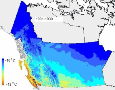 Changes in mean annual temperature from 1901-1930 to the 2080s