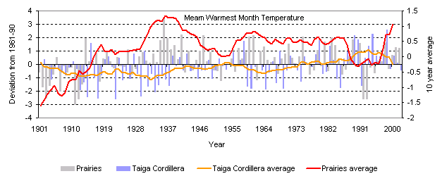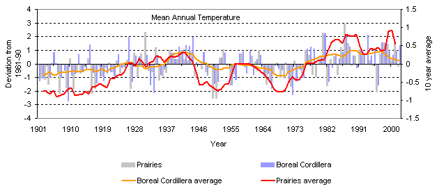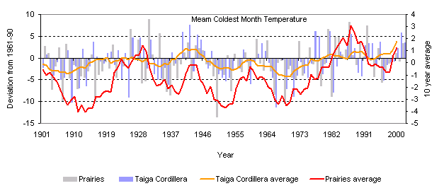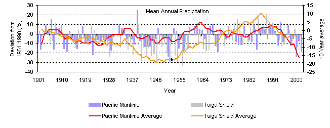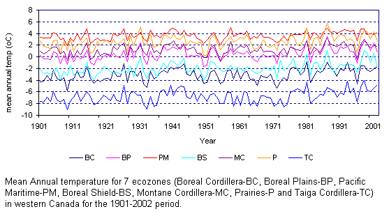 In order to provide a very good visialization of climate change trends in western Canada, deviation of the 1901-2002 annual valules from the 1961-1990 normal were computed for each ecozone. Plot of some of the trends are shown below. Temperature variables exhibit warming trends in all ecozones from 1901 to 2002, whereas precipitation shows a slight reduction at the close of the 20th century.