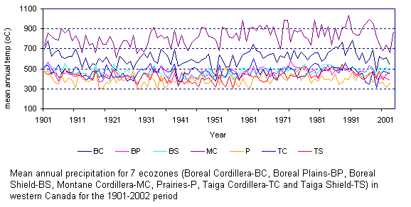 The Pacific Maritime (not i figure) with annual values going to over 11000mm, receives more precipitation than any other ecozone. Despite differences in total amount of precipitaion received, the trend over time seems to be similar in all ecozones.