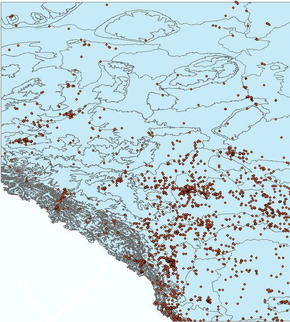 The final product was a flat file with all data with the following variables: Latitude, Longitude, Elevation, Observer number (“PREG” for personal registration number), Location number (LC), Species number (SP), growth stage or phase (PH), date (calendar date), Julian (year date) and then ecosystem zones from the Alberta coverage (NSR, VARIANT, PHASE) and finally our system of ecosystem divisions (ECOSYS).