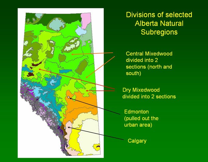 a) Using Arcview GIS 3.3, the Alberta natural subregions layer was used to group observations.