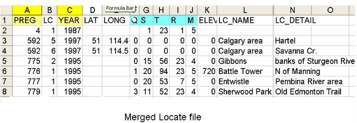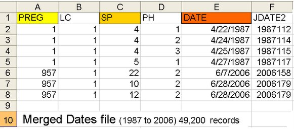 g) The merged files were checked and duplicate entries deleted. The location file was reduced to 4452 unique locations, and the date file had 47,138 records (1987 to 2006). Date and location files were merged.