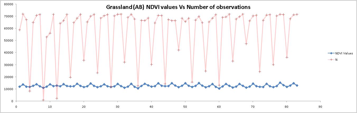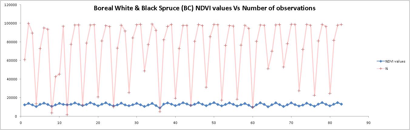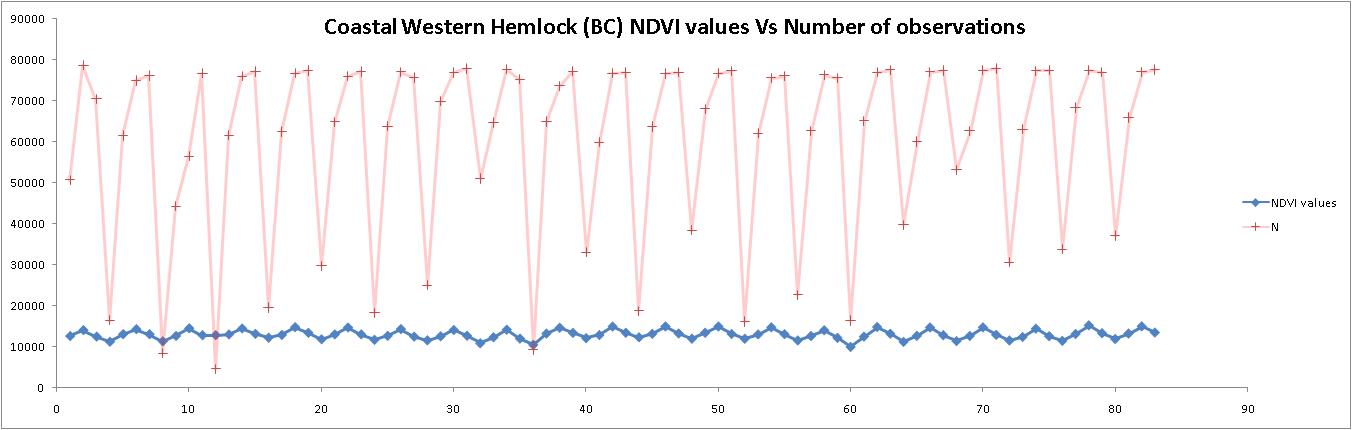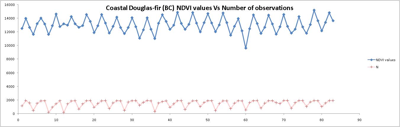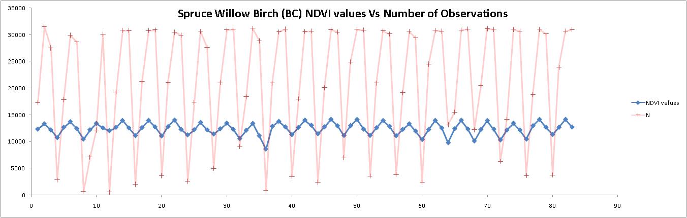 The selected zones went through a first screening to analyze more in depth the NDVI values in relation to the number of observations (N). In the attempt to exclude the possibility of a false outcome as a result of a strong correlation between the NDVI and N, I plotted the NDVI values over the studied period together with the number of observations. The results show no correlation implying that the data can now be statistically analyzed in more depth. For more details on this part of the statistical analysis click on the following ecosystems to visualize the related graph: Grassland, Spruce-Willow-Birch, Boreal White and Black Spruce,Coastal Western Hemlock, and Coastal Douglas-fir.