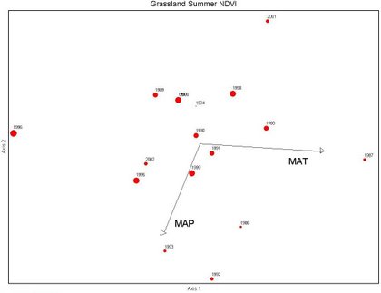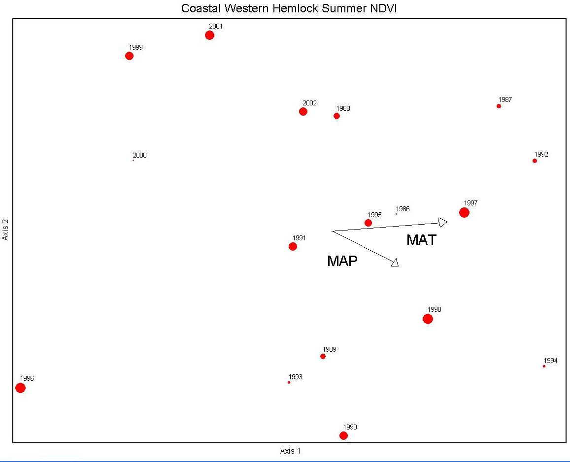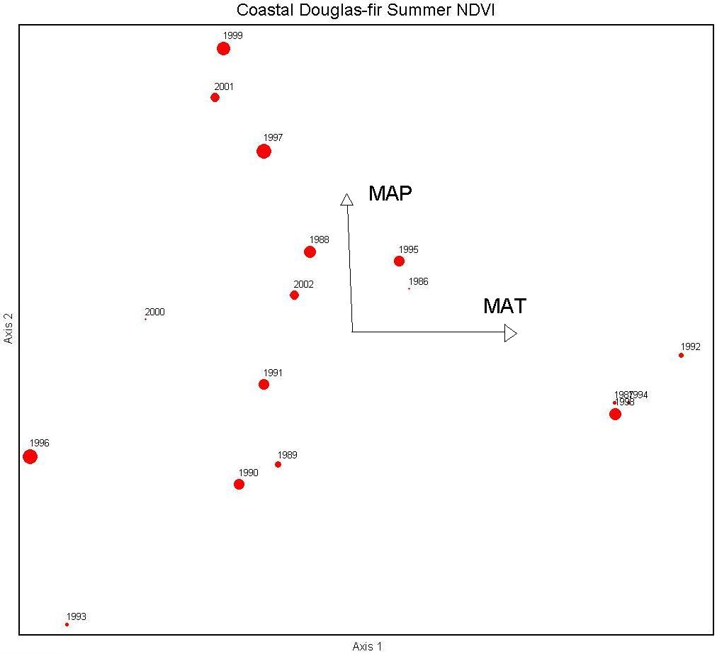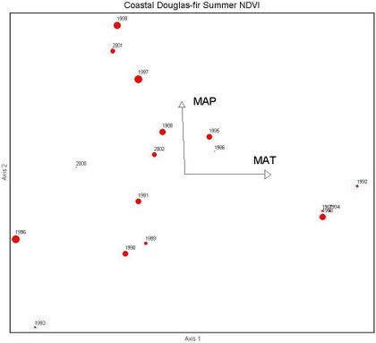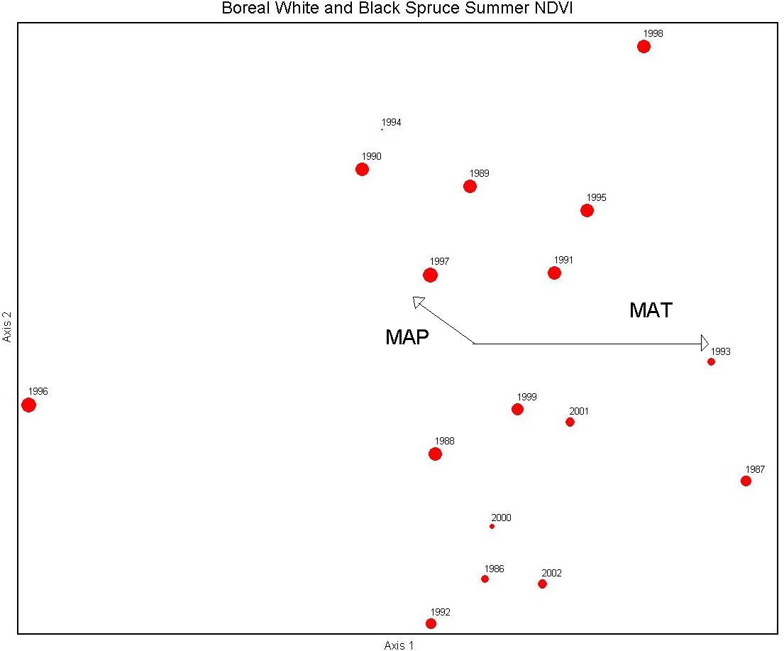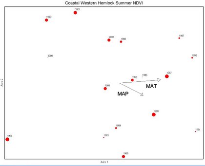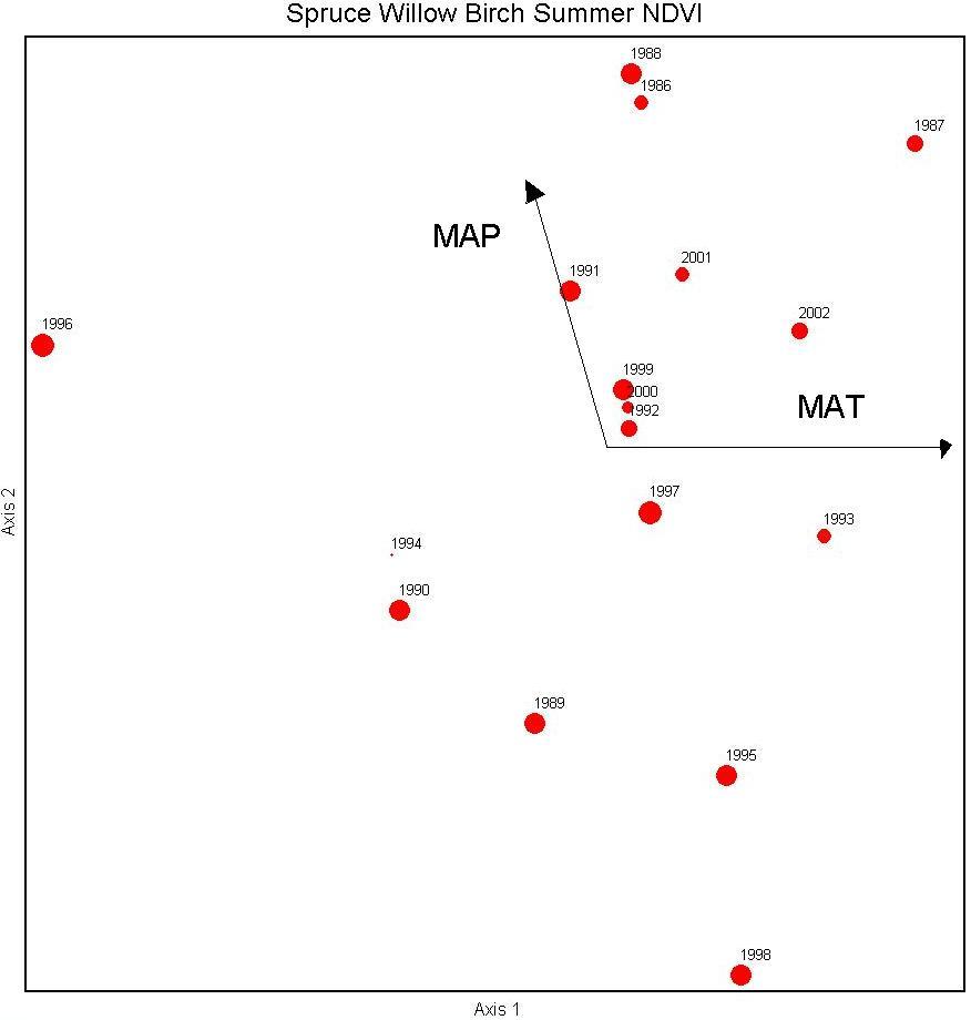 The graph below shows NDVI values for each summer over the studied period (1986-2002) for the Boreal White and Black Sruce (BWBS) zone of BC in relation to MAT and MAP. The size of the red circle reflects the NDVI parameter value and the length of the vectors represent the strength of the correlation. For this northern ecosystem of BC the analysis show quite clearly that annual precipitation is related to higher values of summer productivity. The graph nicely shows how the years with low productivity are located were MAP is lower. Click on the graph for a larger view.