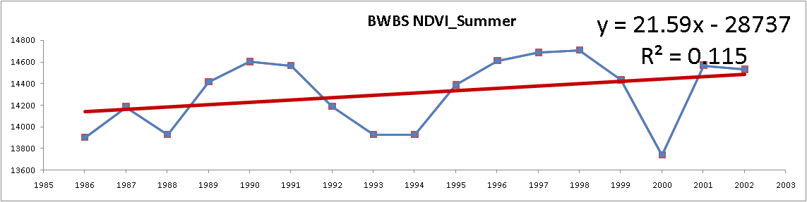 In a more practical way, being the main goal to understand productivity (NPP) changes over time we can simply plot the NDVI values for each summer against time and fit the data with a linear model. For the 3 selected zones of AB and BC we observe that productivity increases slightly over time as shown in the 5 graphs below. Click on the graphs for a larger view.