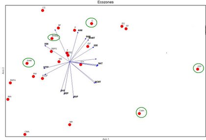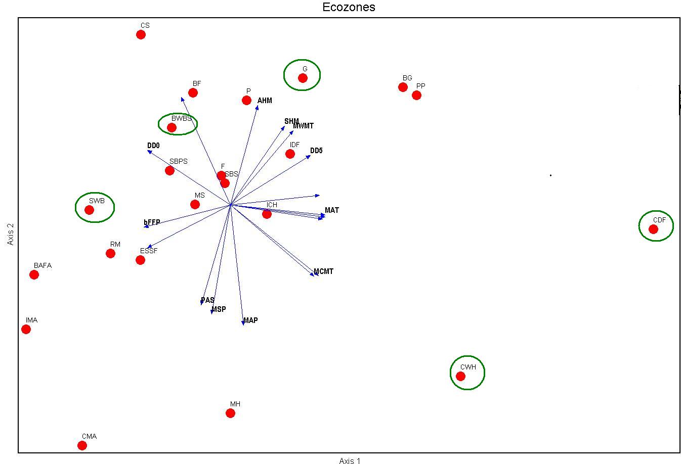 The graph below shows NDVI values averaged from 1986-2002 by the Eco-zones of AB and BC in relation to the climatic variables for the related period such as Mean Annual Temperature (MAT) and Mean Annual Precipitation (MAP) etc. The Principal Component analysis allowed me to calculate which climatic factors are the main drivers of each ecosystem variability. Starting from this analysis I could then more clearly visualize the differences among the ecosystems of AB and BC. Looking at the final graph I selected 5 ecosystems that would significantly represent the studied area. Click on the graph for a larger view.