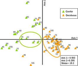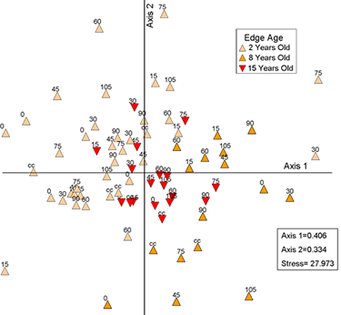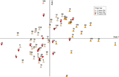 The data was explored using NMS ordination to assess patterns within the community structures of the different sites. Within the ordination it is evident that there are three distinct groups separating out based on the age of the edge (Figure 2).. We also see some evidence of the clear-cut and zero meter sites grouping out within most of the edge ages. Since all edge ages had transects running into similar "intact" forest sites, I would have expected to see the sites farther into the transects being more similar between edge ages. I also expected to see some close similarity between the 2 year old and 8 year old zero meter sites, with the 15 year old zero meter treatments being more similar to intact forest sites as was suggested by the NCAP analysis in the main analysis section. Although the ordination is still interesting, I did not include the NMS in the final analysis because of the high stress value in the ordination. This suggests that the picture presented is not a reliable representation of the actual data set and thus should not be used for data interpretation at this time (McCune and Grace, 2002).