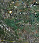 The study was conducted approximately 90 kilometers northwest of Peace River in the Clear Hills Upland, Lower Foothills Ecoregion of Alberta (Figure 1). The site is characteristic of a boreal mixedwood composition with the main dominant tree species being Trembling Aspen (Populus tremuloides), Balsam Poplar (Populus balsamifera), and White Spruce (Picea glauca).