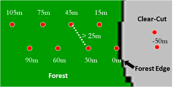 Pitfall traps were placed along transects running from the forest edge to the forest interior (Figure 3). Sampling occurred every 15 meters along the transect up to 105 meters into the intact forest. To ensure independence between samples, a series of two trap lines were used to maintain a minimum distance of 25 meters between traps (Digweed et al., 1995). In order to ensure the variability expected along the forest edge was adequately sampled, a second replicate transect was erected a minimum of 100 meters away. These replicates were pooled within sites for data analysis. In addition, two traps were placed in the clear-cut sites, a minimum of 50 meters from the forest edge (Figure 3).