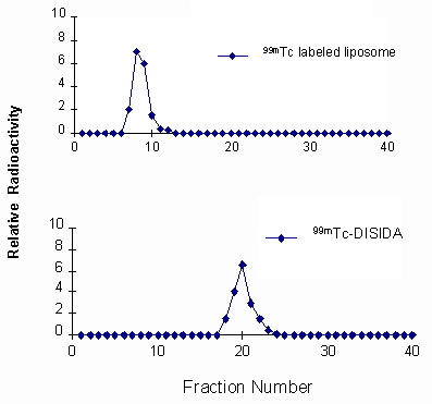 Values are expressed as mean ± standard deviation (n=4). Chromatography profile of the labeled liposomes on a Sephadex G-25 column shows that almost 90% of the radioactivity was recovered in the void volume associated with the liposome fraction (Figure 2). However, 99mTc-DISIDA alone eluted much later when chromatographed separately.