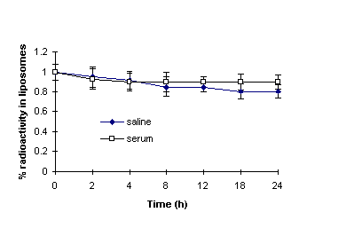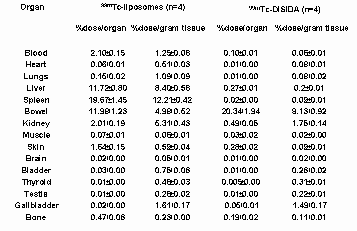 Data derived from mean ± standard deviation (n=4). Acknowledgments M.R.S. thanks MRC and Biomira for chair support, ACB and NSERC for grant funding. References Bangham, A. D., Standish, M. M. and Watkins, J. C. The action of steroids and streptolysin S on the permeability of phospholipid structures to cations. J Mol Biol 13: 138-144, 1965. Gregoriadis, G. and Florence, A. T. Liposomes in drug delivery. Drugs 45: 15-28, 1993. Kim, S. Liposomes as carriers for cancer chemotherapy: current status and future prospects. Drugs 46: 618-638, 1994. Mayer, L. D., Nayar, R., Thies, R. L., Boman, N. L., Cullis, P. R. and Bally, M. B. Identification of vesicle properties that enhance the antitumour activity of liposomal vincristine against murine L1210 leukemia. Cancer Chemother Pharmacol 33: 17-24, 1993. Mayer, L. D. and St.-Onge, G. Determination of free and liposome-associated doxorubicin and vincristine levels in plasma under equilibrium conditions employing ultrafiltration techniques. Anal Biochem 232: 149-57, 1995. Gabizon, A., Chemla, M., Tzemach, D., Horowitz, A. T. and Goren, D. Liposome longevity and stability in circulation: effects on the in vivo delivery to tumors and therapeutic efficacy of encapsulated anthracyclines. J Drug Target 3: 391-398, 1996. Bally, M. B., Masin, D., Nayar, R., Cullis, P. R. and Mayer, L. D. Transfer of liposomal drug carriers from the blood to the peritoneal cavity of normal and ascitic tumor-bearing mice. Cancer Chemother Pharmacol 34: 137-146, 1994. Rahman, A., Treat, J., Roe, J. K., Potkul, L. A. and Alvord, W.G. Phase I clinical trial and pharmacokinetic evaluation of liposomal encapsulated doxorubicin. J Clin Oncol 8: 1093-1100, 1990. Lim, H. J., Masin, D., Madden, T. D. and Bally, M. B. Influence of drug release characteristics on the therapeutic activity of liposomal mitoxantrone. J Pharmacol Exp Ther 281: 566-73, 1997. Loughrey, H. C., Ferraretto, A., Cannon, A. M., Acerbis, G., Sudati, F., Bottiroli, G., Masserini, M. and Soria, M. R. Characterization of biotinylated liposomes for in vivo targeting applications. FEBS Letters 332: 183-188, 1993. Lasic, D. Liposomes. American Sci 80: 20-31, 1992. Gregoriadis, G., Neerunjun, D. E. and Hunt, R. Attempts to improve localization in tumor tissues. Life Sci 21: 357-370, 1977. Richardson, V. J., Jeyasingh, K., Jewkes, R. F., Ryman, B. E. and Tattersall, M. H. N. Possible tumor localization of Tc-99m-labeled liposomes: effects of lipid composition, charge and liposome size. J Nucl Med 19: 1049-1054, 1978. Oku, N., Namba, Y., Takeda, A. and Okada, S. Tumor imaging with technetium-99m-DTPA encapsulated in RES-avoiding liposomes. Nucl Med Biol 20: 407-412, 1993. Tilcock, C., Ahkong, Q. F. and Fisher, D. Polymer-derivatized technetium 99mTc-labeled liposomal blood pool agents for nuclear medicine applications. Biochim Biophys Acta 1148: 77-84, 1993. Ogihara-Umeda, I., Sasaki, T., Toyama, H., Oda, K., Senda, M. and Nishigori, H. Rapid tumor imaging by active background reduction using biotin-bearing liposomes and avidin. Cancer Res 54: 463-467, 1994. Ogihara-Umeda, I., Sasaki, T., Kojima, S. and Nishigori, H. Optimal radiolabeled liposomes for tumor imaging. J Nucl Med 37: 326-332, 1996. Presant, C. A., Proffitt, R. T. and Turner, A. F. Successful imaging of human cancer with Indium-III labeled phospholipid vesicles. Cancer 62: 905-911, 1988. Presant, C. A., Blayney, D., Proffitt, R. T., Turner, A. F., Williams, L. E., Nadel, H. I., Kennedy, P., Wiseman, C., Gala, K. and Crossley, R. J. Preliminary report: imaging of Kaposi sarcoma and lymphoma in AIDS with indium-111-labelled liposomes. Lancet 335: 1307-1309, 1990. Kubo, A., Nakamura, K. and Sammiya, T. Indium-111-labeled liposomes: dosimetry and tumor detection in patients with cancer. Eur J Nucl Med 20: 107-113, 1993. McDougall, I. R., Dunnick, J. K., Goris, M. L. and Kriss, J. P. In vivo distribution of vesicles loaded with radiopharmaceuticals: a study of different routes of administration. J Nucl Med 16: 488-492, 1975. Phillips, W. T., Rudolph, A. S., Goins, B., Timmons, J. H., Klipper, R. and Blumhardt, R. A simple method for producing a technetium-99m-labeled liposome which is stable in vivo. Nucl Med Biol 19: 539-547, 1992. Hernandez M. and Rosenthall, L. A cross-over study comparing the kinetics of Tc-99m-labeled isopropyl and p-butyl IDA analogs in patients. Clin Nucl Med 5:159-165, 1980. Klingersmith, W. C., Fritzberg, A. R. and Spitzer, V. M. Clinical comparison of Tc-99m diisopropyl-IDA and diethyl-IDA for evaluation of the hepatobiliary system. Radiology 140: 791-795, 1981. Allen, T. M., Hansen, C., Martin, F., Redemann, C. and Yau-Young, A. Liposomes containing synthetic lipid derivatives of poly (ethylene glycol) show prolonged circulation half-lives in vivo. Biochim Biophys Acta 1066: 29-36, 1991. Fiske, C. H. and Subbarow, Y. The colorimetric determination of phosphorus. J Biol Chem 66: 375-400, 1925. New, R. R. C. Paper chromatography of labeled liposomes, in New R.R.C. (ed) Liposomes: a practical approach, IRL Press, New York, NY, pp105-162, 1990. Wu, M. S., Robbins, J. C., Ponpipom, M. M. and Shen, T. Y. Modified in vivo behavior of liposomes containing synthetic glycolipids. Biochim Biophys Acta 674: 19-29, 1981. Gabizon, A., Price, D. C., Huberty, R. S. and Papahadjopoulos, D. Effect of liposome composition and other factors on the targeting of liposomes to experimental tumors: biodistribution and imaging studies. Cancer Res 50: 6371-6378, 1990. Goins, B., Klipper, R., Rudolph, A. S., Cliff, R. O., Blumhardt, R., and Phillips, W. T. Biodistribution and imaging studies of technetium-99m-labeled liposomes in rats with focal infection. J Nucl Med 34: 2160-2168, 1993. Espinola, I. R., Dunnick, J. K., Goris, M. L. and Kriss, J. P. Radiolabeled liposomes as metabolic and scanning tracers in mice. II. In-III oxime compared with Tc-99m-DTPA, entrapped in multilamellar lipid vesicles. J Nucl Med 20: 434-440, 1979. Love, W. G., Amos, N., Williams, B. D