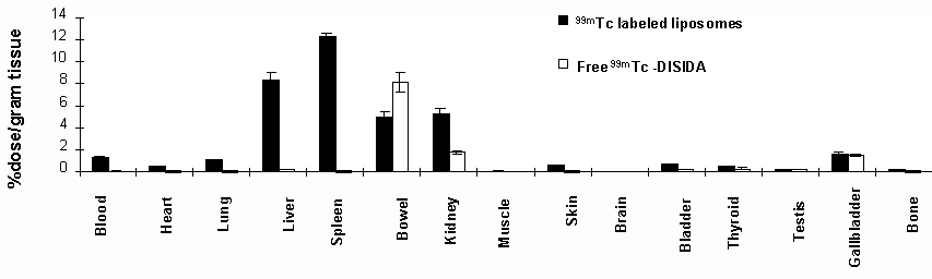 Biodistribution studies obtained from tissue samples at 24 h. post-injection of 99mTc labeled liposomes (Figure 4 and Table 2) show that significant radioactivity was localized in the liver and spleen (8.4% and 12.2% dose/gram, respectively, P<0.001) comparing with free 99mTc-DISIDA. This is because the liver and spleen are two major organs of the reticuloendothelial system (RES) which are known to accumulate and metabolize liposomes. However, 99mTc-DISIDA, used for imaging and functional studies of liver and bile, is processed by the hepatocytes within a few minutes after administration and excreted rapidly via the hepatobiliary system to the intestine (36). Therefore, after 24 h post-injection, there is much less radioactivity remaining in liver (0.2% dose/gram) and spleen (0.09% dose/gram). Significant difference was also found in the blood pool due to longer circulation time of liposomes compared to rapid excretion of free 99mTc-DISIDA. The conventional liposome formulations have a tendency to accumulate in the reticuloendothelial system and this has compromised their applications in drug delivery involving other tissues (37). Recently, liposomes exhibiting greatly prolonged blood retention were developed, by incorporating certain lipids, such as mono-sialo-ganglioside (GM1) or synthetic lipids derivatized with the hydrophilic polymer polyethylene glycol, into the liposomal membrane (38). Improved therapeutic effect was observed using the long-circulating liposomes (37, 39). For tumor imaging, long-circulating liposomes may be attractive candidates due to their high tumor accumulation (40). Thus, the methodology we described above could also be employed for labeling long-circulating liposome post-formulation of these vesicles. In conclusion, the labeling technique presented here shows a practical alternative for monitoring pharmacokinetic and pharmacodynamic changes of liposomes or liposomal derivatives, and could also be used for tumor or infection imaging, especially coupled with targeting antibodies. Figure 4. Biodistribution curve shows the difference of tissue uptake between 99mTc labeled liposomes and free 99mTc-DISDIA.