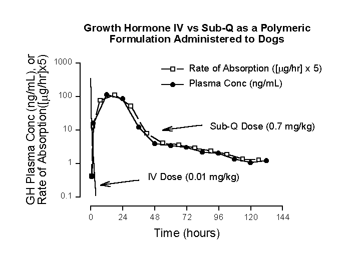where (V z)(K) is clearance (CL). Equation 2 indicates that under these conditions, rate of absorption approximates rate of elimination. When this is observed, which can exist during many or most segments of a plasma concentration-time profile, regardless of complexity, the pharmacokinetic profile is in a state of "flip-flop," viz., rate of absorption approximates rate of elimination. In a simplified sense, a "flip-flop" exists when rate of absorption is the rate-limiting step in the sequential/parallel processes of drug absorption, distribution and elimination. The "trap" commonly fallen into is that the terminal exponential phase half-life following extra-vascular dosing is mistakenly thought to exemplify terminal drug disposition, when in fact it characterizes terminal exponential drug absorption half-life. The "trick" that can be applied is simply to recognize that in a "flip-flop" model, the plasma concentration-time profile tends to closely parallel rate of absorption. This provides a simple and effective way to visualize the shape of the rate of absorption profile, without the necessity of deconvolution, e.g., Wagners modification of the Loo-Riegelman equation (2).Figure 1. Recombinant human growth hormone (GH) mean semilogarithmic plasma concentration-time profiles (3) following: an intravenous bolus injection of 0.2 mg/kg doses to 4 dogs (theoretical profile based on mean parameters from biexponential curve-fits); and a profile following subcutaneous administration of 0.7 mg/kg doses in a poloxamer gel formulation administered to 4 dogs. Rate of absorption was calculated by Wagners modification of the Loo-Riegelman equation (2). The multiplication of rate of absorption by a factor of 5 was selected to deliberately position the rate of absorption profile close the plasma concentration-time profile, thus facilitating comparison of the two functions. Figure 1 illustrates a "flip-flop" pharmacokinetic system. Note the rapidity of intravenous growth hormone (GH) disposition compared to the profile following subcutaneous dosing of the gel formulation. GH intravenous disposition is biexponential, with disposition half-lives of 0.0687 and 0.574 hours. The more rapid exponential term virtually completely disappears after about ten half-lives (0.687 hours), after which intravenous disposition becomes monoexponential. Additionally and more importantly, Equation 1 is applicable to extravascular plasma concentration-time profiles after 0.687 hours, since the only significant influences impacting the GH plasma concentration-time profile derive from absorption and terminal exponential disposition processes. Applying Equation 1 to plasma concentration-time data for the subcutaneous formulation at 48 and 72 hours, DC/Dt = 0.0375 ng/mL/hour. At the midpoint of this time period (60 hours), (K)(C) = 4.55 ng/mL/hr. Since KC >> DC/Dt, rate of absorption » rate of elimination, and a "flip-flop" condition exits. Even though this was established using absorption phase, terminal exponential data, the "flip-flop" condition exists throughout most of the profile, since the downward slope of the profile from the gel formulation never approaches the steepness of the plasma concentration-time function following IV doses. As noted above ("trick"), the plasma concentration-time profile from the gel formulation closely mirrors the rate of absorption profile. This provides an easy way to access the shape of an absorption rate profile in a "flip-flop" model. ReferencesCorresponding author: Harold Boxenbaum, Arishel Inc., 14621 Settlers Landing Way, North Potomac, Maryland, 20878-4305, USA, email:shelbyb@ix.netcom.com Keywords: Pharmacokinetic, Flip-Flop, Growth Hormone