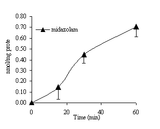 Figure 1. Appearance of midazolam in the serosal media during gut sac incubation with 100 µM midazolam (mean of 6 sacs ± SD).