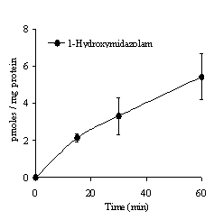 Figure 2. Appearance of 1-hydroxymidazolam in the serosal medium during gut sac incubation with 100 µM midazolam in the mucosal media (mean of 6 sacs ± SD).