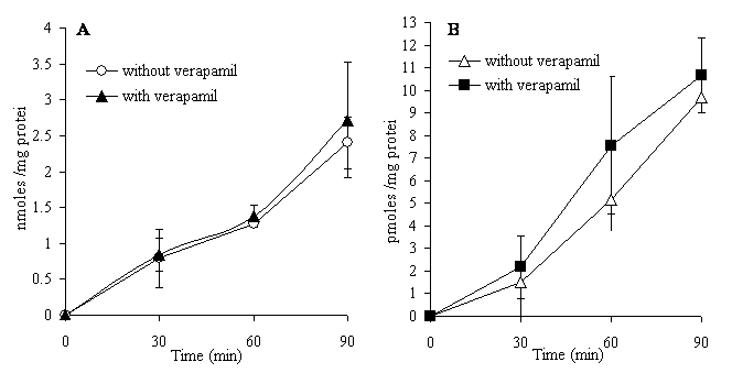 Figure 4. Accumulation of dextromethorphan (A) or 3-methoxymorphinan (B) in the serosal medium with or without verapamil (100 µM) co-incubated with 100 µM dextromethorphan in the mucosal media. Each point is the mean ± SD of four sacs of two independent experiments.