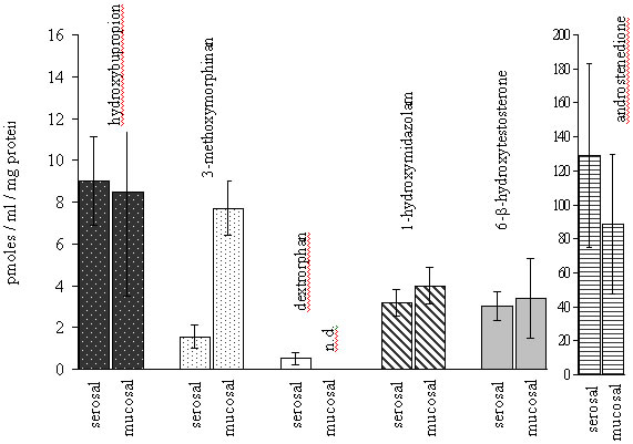 In spite of the various approaches used to study intestinal metabolism, there is still a need for simple in vitro models to study intestinal metabolism during the absorption of drugs by the intestine. The preparation of intestinal microsomes appears to be more difficult than for hepatic microsomes and the enzymatic activity of such microsomes depends considerably on the preparation technique and can be affected by the freezing (17,43). It is also difficult to extrapolate from the rates of metabolism obtained with isolated microsomes to the situation in vivo because the rate of metabolism is dependent on many physiological factors, not least, the rate of transport of drugs into the cells and the intactness of the whole cells. Dextromethorphan O-demethylation (dextrorphan formation) and hydroxybupropion formation are often chosen to monitor respectively the activity of CYP2D6 and 2B6 in man. Dextromethorphan can also be N-demethylated to give 3-methoxymorphinan as a result of the activity of CYP3A4, and thus is a probe for two different enzyme activities depending on the metabolites formed, whereas testosterone and midazolam are often used as markers of CYP3A4/1 activity. The formation of 1-hydroxymidazolam, after incubation of the sacs with 100µM midazolam, confirms the CYP3A4/1 enzyme activity in gut during the passage of midazolam across the epithelium. CYP3A activity was previously demonstrated for methadone (33) and testosterone (34) with the same model. In addition, dextromethorphan N-demethylation (3-methoxymorphinan production) also reflects CYP3A activity.