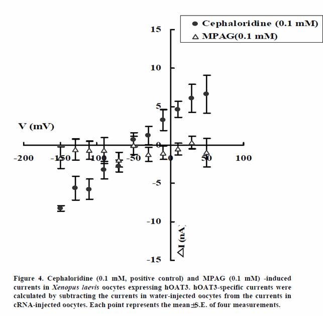 In the same way, we examined whether MPAG inhibited uptake of the substrate via hOAT3. The inhibitory effect of MPAG on the uptake of ES (a typical substrate for hOAT3) by Xenopus laevis oocytes expressing hOAT3 was examined. The dose-response relationship for the inhibition of ES uptake by MPAG is shown in Figure 2. MPAG remarkably inhibited the uptake of ES, and the calculated IC50 value was 41.5±11.5 µM. The inhibitory effect of MPAG for hOAT3 was stronger than that for hOAT1. This result suggests that MPAG is able to be an inhibitor or substrate of hOAT3 and that affinity of MPAG for hOAT3 is higher than that for hOAT1.