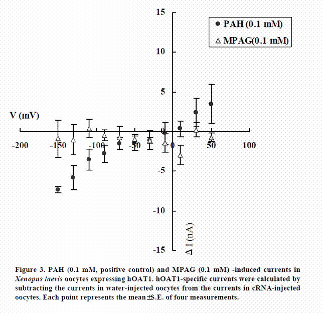 We examined whether MPAG is not only inhibitor of hOAT1 and hOAT3 but also substrate. The transport activities of MPAG via hOAT1 and hOAT3 were studied by electrophysiological methods. The activities were assessed by monitoring currents induced by the tested drugs in hOAT1- or hOAT3-expressing oocytes under voltage-clamp conditions. PAH and cephaloridine were used in this study as positive controls for hOAT1 and hOAT3, respectively. As shown in Figures 3 and 4, PAH and cephaloridine induced currents in hOAT1- and hOAT3-expressing oocytes, respectively. On the other hand, MPAG did not induce any current. These results suggest that MPAG is not excreted into urine via hOAT1 and hOAT3 in human or MPAG is transported via hOAT1 and hOAT3 with electroneutral manner.