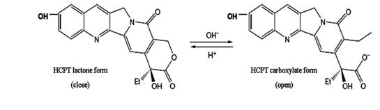 Hydroxycamptothecin (HCPT) is a promising derivative of camptothecins (CPT) which possesses the ability to inhibit the growth of a wide range of human tumors. HCPT acts on topoisomerase I, inhibit DNA replication and RNA transcription by stabilizing the cleavable complexes formed between topoisomerase I and DNA (1, 2). Therefore, HCPT and other camptothecin analogues have recently undergone extensively clinical evaluation worldwide (3-5). The preservation of α-hydroxy-δ-lactone ring of HCPT is crucial for its anti-tumor activity (6). However, the delivery of the lactone form is quite challenging, since the lactone exists in a pH-dependent equilibrium with an open carboxylate (Figure 1), and the lactone form with the closed E-ring has poor solubility. Furthermore, human serum albumin is shown to bind preferentially to the carboxylate form resulting in the more rapid opening of the lactone ring in blood (7).