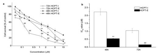 Figure 2. Antiproliferative activity of HCPT-I and HCPT-E in HeLa cells. Dose-and time-dependent cytotoxicity of HCPT (a), IC50 values ( µM ) of HCPT preparations (b). Data as mean ± S.D., n=4. *P#0.05, **P#0.01 vs. HCPT-I for 48h; # P#0.05, ## P#0.01 vs. HCPT-I for 72h.