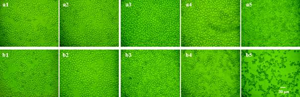 Figure 3. Morphological changes of HeLa cells at 0, 12, 24, 48 and 72h after treating with HCPT-I (a1, a2, a3, a4 and a5) or HCPT-E (b1, b2, b3, b4 and b5) for 4h (magnification ´ 200).
