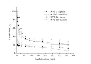 Figure 4. Preservation of lactonic ring by HCTP-E in the presence of human plasma and culture medium supplemented with 10% fetal bovine serum. Data as mean ± S.D., n=3. *P<0.05, **P<0.01 vs. HCPT-I.