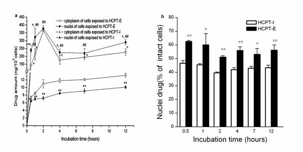 Figure 5. Intracellular distribution of HCTP-E and HCTP-I. HCTP levels in cytoplasm and nuclei (a).The percentage of nuclei drug in total uptaken drug amounts (b). Data as mean ± S.D., n=3. *P<0.05, **P<0.01 vs. cytoplasm; # P<0.05, ## P<0.01 vs. nuclei of HeLa cells incubated with HCPT-I; + P<0.01 vs. cytoplasm of HeLa cells incubated with HCPT-I.