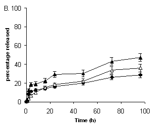 Figure 1. Kinetics of of DOX and VER release from Tf-L-DOX/VER or Tf-L-DOX in various media. (A) DOX release from Tf-L-DOX/VER; (B) DOX release from Tf-L-DOX; (C) VER release from Tf-L-DOX/VER. Error bar = 1 standard deviation (n=3).
