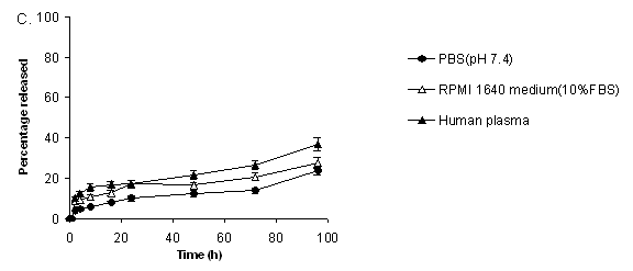 Rates of drug release from liposomes were determined by measuring retention of the drugs. Liposomes (100 µL) were added to 900µL of PBS (pH 7.4), human plasma, or cell culture medium (RPMI-1640) containing 10% FBS and were incubated at 37°C. Free and liposome encapsulated DOX were separated by a Sepharose CL-4B column, as described above. For DOX concentration analysis, liposomes were lysed by ethanol. At various time points (0.5, 1, 2, 4, 8, 16, 24, 48, and 72 h), DOX concentration was determined based on its fluorescence by fluorometry, using excitation at 485 nm and emission at 550 nm. VER concentration was determined by HPLC, as described above. The percentages of drug released were then calculated from percentages of drug remaining in the liposome fractions.