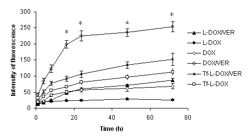 Figure 3. Accumulation of various DOX formulations in K562/DOX cells. Cells were incubated in RPMI 1640 medium containing various DOX formulations. Cell-associated DOX was then determined based on DOX fluorescence (excitation at 485nm, emission at 550nm) by quantitative fluorometry. Error bar equals 1 standard deviation (n=3). * indicates significant difference versus Tf-L-DOX/VER or p<0.05.