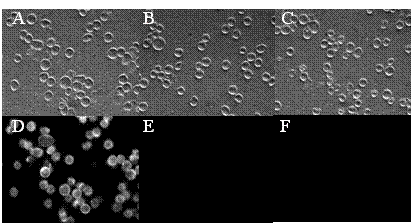 Figure 2. Uptake of Tf-L-DOX and L-DOX by K562 cells. K562 cells were treated with Tf-L-DOX, L-DOX, or Tf-L-DOX plus 2 mg/mL free Tf, and photographed in both fluorescence (upper panels) and phase-contrast (lower panels) modes on a Nikon Eclipse 800 fluorescence microscope. All the samples were incubated for 4 h at 37°C. (A) and (D): cells treated with Tf-L-DOX; (B) and (E): cells treated with L-DOX; (C) and (F): cells treated with Tf-L-DOX plus 2 mg/mL free Tf.
