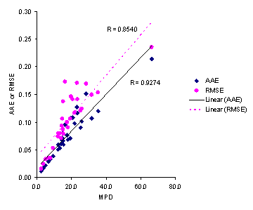 Figure 5. Correlations between AAE and RMSE with MPD accuracy criteria for solubilities predicted by the Jouyban-Acree model.
