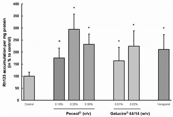 Caco-2 cells were pretreated for 24 hours with 0.1, 0.25 and 0.5 % (v/v) Peceol® ,0.01 and 0.02% (w/v) Gelucire® 44/14 or 100 mM verapamil as control for Pgp inhibition. Cells were washed and fresh treatment solutions plus 5 mM Rh123 were added for another 3 hours and the accumulation of Rh123 in lysed cells was determined. Rh123 accumulation in Peceol®, Gelucire® 44/14 and verapamil treated Caco-2 cells was compared to untreated control cells. Data expressed as the mean percent to control normalized for the protein ± standard deviation for n=6 (*P<0.05).